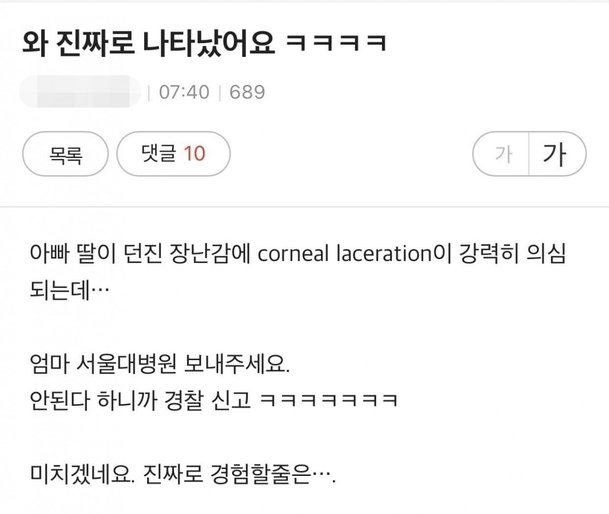 최근 응급의학과 봉직의들이 모인 온라인 카페에는 '와 진짜로 나타났어요'라는 제목의 글이 올라왔다. 작성자는 "아빠가 딸이 던진 장난감에 (다쳐) corneal laceration(각막 열상)이 강력히 의심되는 (상황이었는데) 엄마는 '서울대병원에 보내달라'고 했다"며 "안 된다고 하니까 경찰 신고. 미치겠다. 진짜로 경험할 줄은…"이라고 적었다.