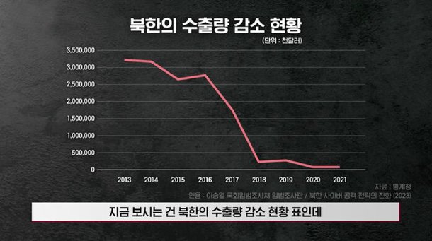 북한의 수출량 감소 현황 표입니다. 북한에 대한 강력한 경제 제재가 가해졌던 2016년과 2017년을 기점으로, 북한의 수출량이 뚝 떨어진 걸 볼 수 있습니다.