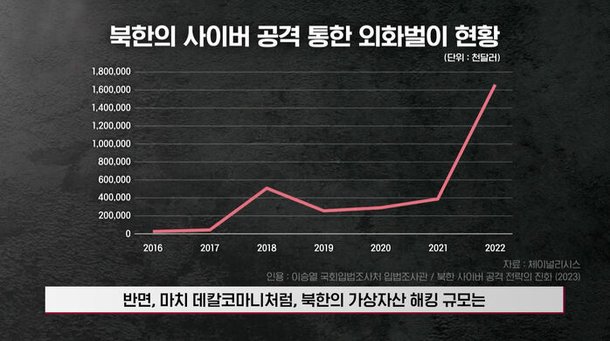 반면, 마치 데칼코마니처럼, 북한의 가상자산 해킹 규모는 그 시점을 기준으로 눈에 띄게 늘기 시작한 것도 확인할 수 있습니다. 안그래도 만성적인 무역 적자였던 북한이, 강력한 경제 제재를 계기로 가상자산 해킹에 점차 본격적으로 뛰어든 것으로 볼 수 있는 겁니다.
