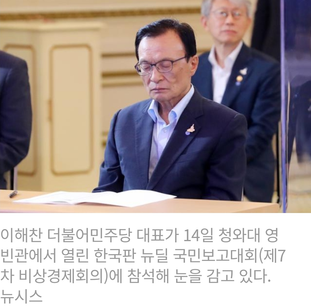 이해찬 더불어민주당 대표가 14일 청와대 영빈관에서 열린 한국판 뉴딜 국민보고대회(제7차 비상경제회의)에 참석해 눈을 감고 있다. 뉴시스