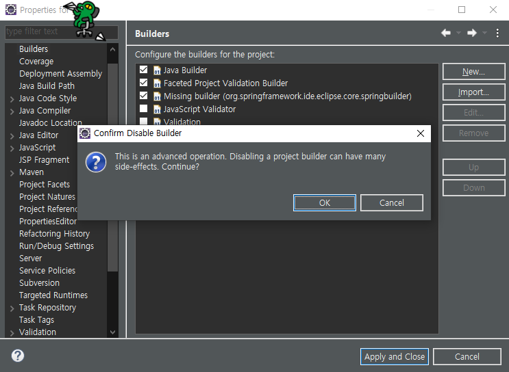 This is an advanced operation. Disabling a project builder can have many side-effects. Continue?