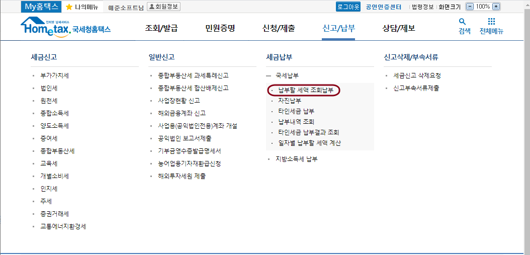 그래서 메뉴를 살펴봤더니, '납부할 세액 조회납부' 라는 메뉴가 있었다.