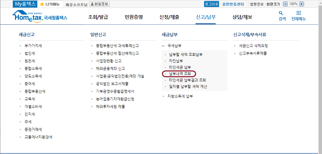 그래서 메뉴를 살펴봤더니, '납부할 세액 조회납부' 라는 메뉴가 있었다.