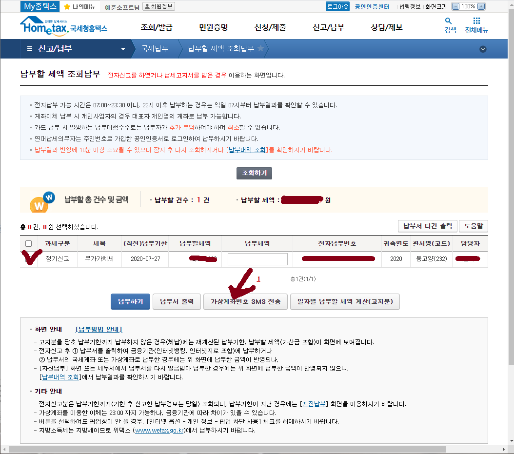 (① 체크박스에 체크하고, ② 납부세액에 입금을 금액(4만 얼마)을 입력, ③ 가상계좌번호 SMS 전송 클릭)