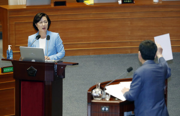추미애 법무부 장관이 24일 서울 여의도 국회에서 열린 본회의 교육·사회·문화 대정부질문에 참석해 곽상도 미래통합당 의원 질의에 답변하고 있다. /뉴시스