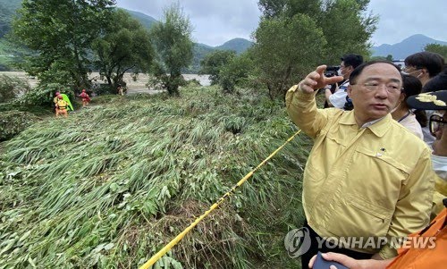 의암호 실종 경찰정 발견현장 찾은 홍남기 부총리(춘천=연합뉴스) 박영서 기자 = 의암댐 선박 전복 사고 발생 이틀째인 7일 강원 춘천시 남산면 춘성대교 인근 북한강에서 사고 경찰정이 발견된 가운데 홍남기 부총리 겸 기획재정부 장관이 현장을 둘러보고 있다.