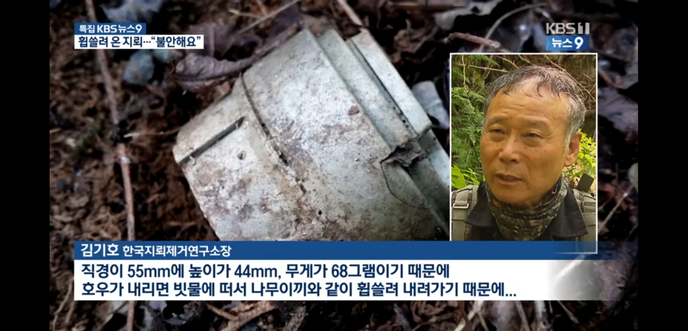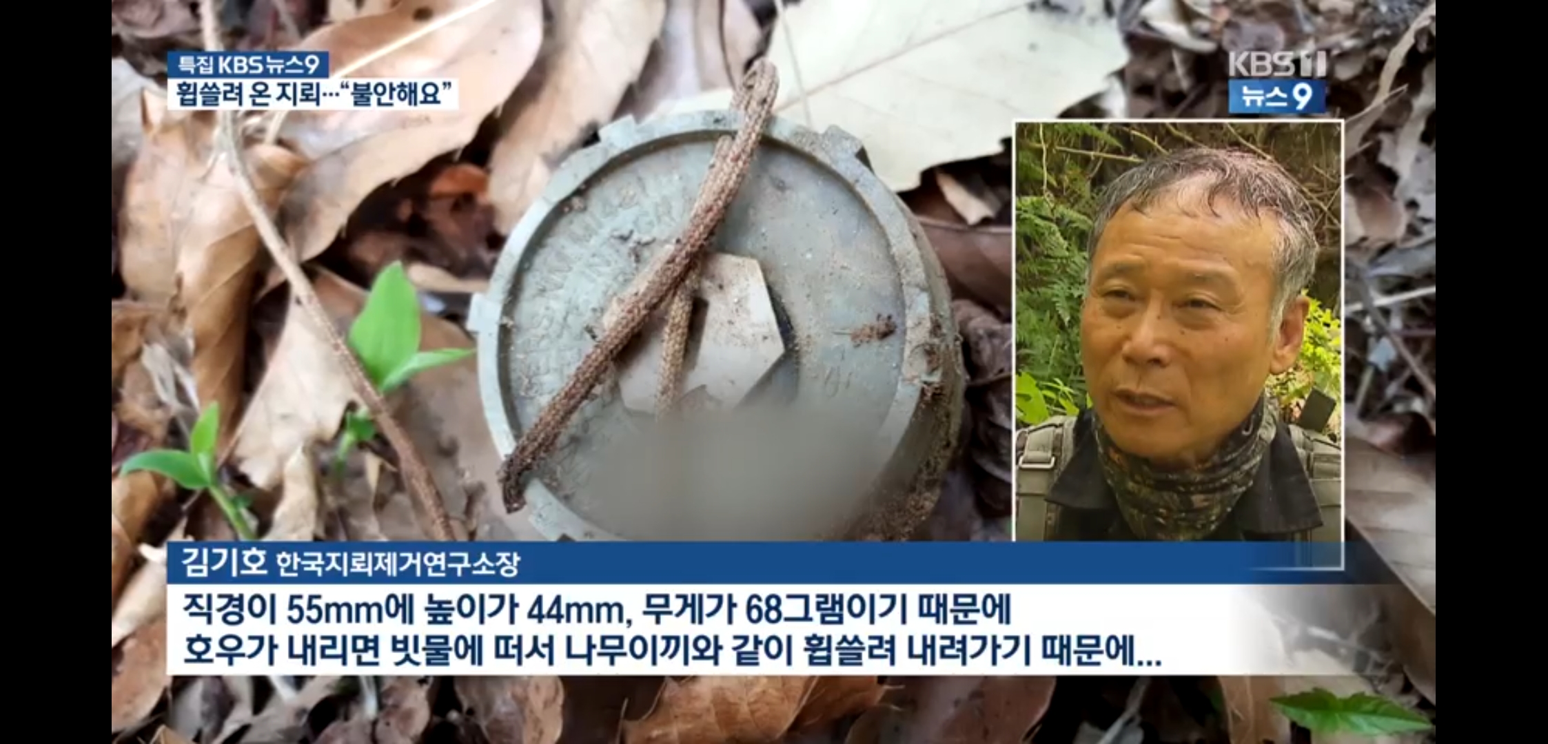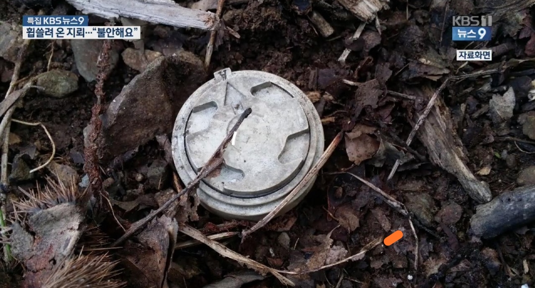 [김기호/한국지뢰제거연구소장 : "직경이 5.5cm에 높이가 4cm, 무게가 68그램 이기 때문에 호우가 내리면 빗물에 떠서 나무이끼와 같이 휩쓸려 내려가기 때문에..."]