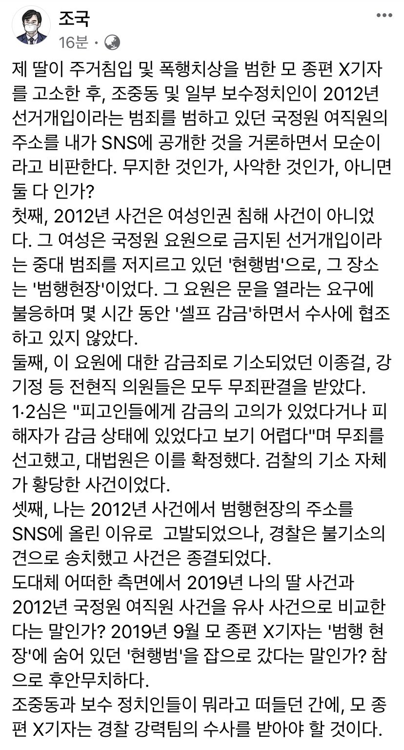 조 씨는 지난해 대통령민정수석비서관을 끝내자마자 법무부 장관으로 지명되리라는 예상 속에서도 서울대에 복직 신청을 했다. 서울대 법학 교수는 장관 자리와도 바꾸지 않는다고 한다. 그가 그런 영광스러운 자리를 차지할 만큼의 학자적 양심이 있는지 의문이다. 이번 연구진실성위원회 위원장은 박정훈 서울대 로스쿨 교수였다. 그는 현 정부에서 경찰위원회 위원장을 맡고 있다. 재심 청구가 들어갈 것으로 알려졌다. 서울대에 위원장을 바꿔 재심할 것을 권한다.