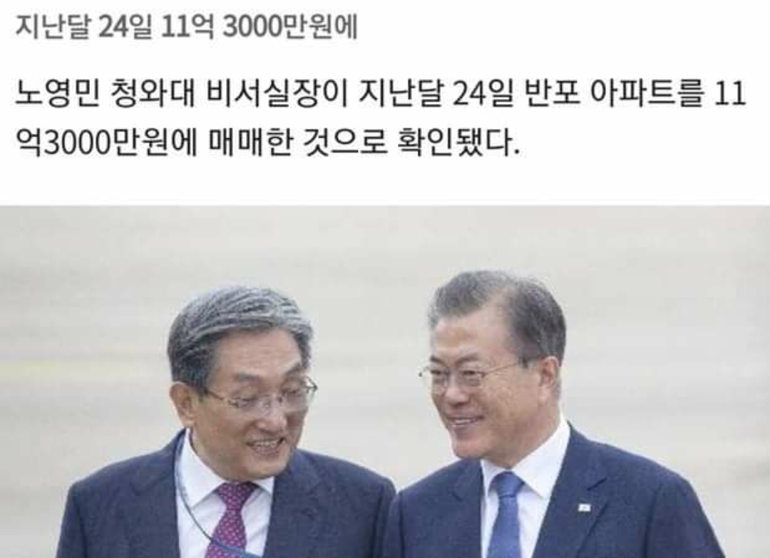 노영민 대통령 비서실장이 매각하겠다고 약속한 서울 서초구 반포동 아파트가 지난달 11억3천만원에 팔린 것으로 확인됐다.