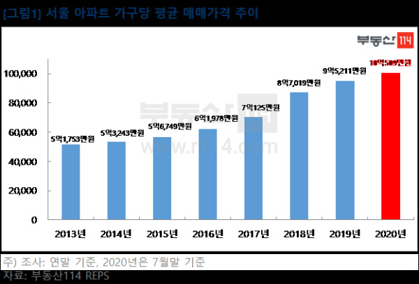 서울 아파트 평균 매매가격이 10억원을 돌파했다. 2013년 5억원 초반에 머물던 평균 매매가격이 7년 만에 2배로 치솟았다.