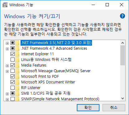 놀랍게도 윈도우 10에서는 .NET Framework 3.5 설치가 안되도록 기본설정되어 있다.