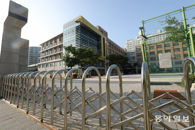 원격수업 전환… 굳게 닫힌 교문 18일 서울 성북구의 한 초등학교 교문이 굳게 닫혀 있다. 이 학교는 당초 이날 개학할 예정이었으나 성북구 소재 사랑제일교회에서 신종 코로나바이러스 감염증(코로나19) 확진자가 늘어나자 교육당국의 지침에 따라 원격수업을 진행하기로 했다. 장승윤 기자 tomato99@donga.com