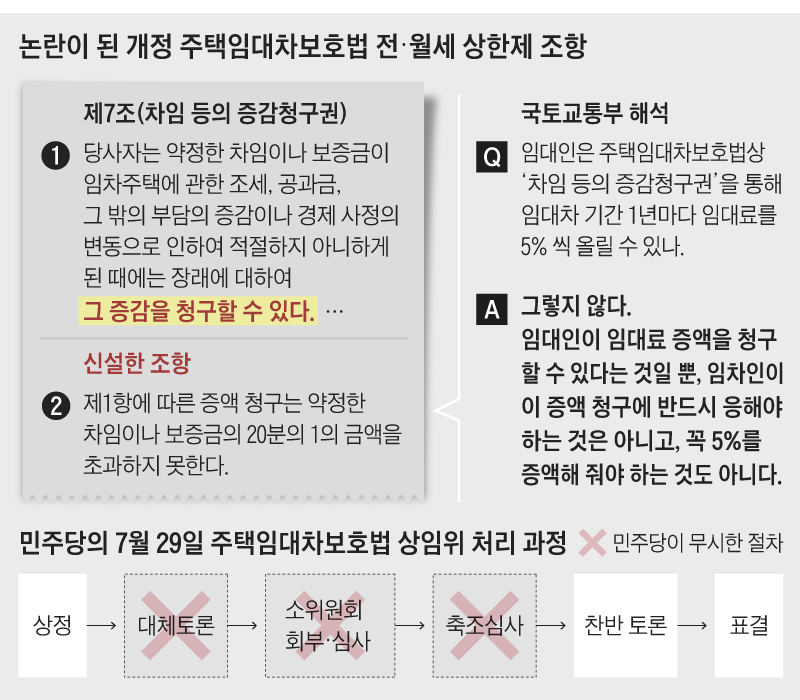 세입자 동의없인 전월세 못올린다더니 민주당 어이없는 '立法 사고' 심사없이 이뤄진 속전속결 법안, 임대료 최대 5% 올릴수 있지만 세입자의 수용 의무는 명시 안해, 졸속처리 민주당 사고쳤..
