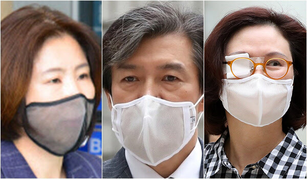 왼쪽부터 '망사마스크'를 착용한 미래통합당 김미애 의원, 조국 전 법무부 장관, 정경심 동양대 교수./연합뉴스 등
