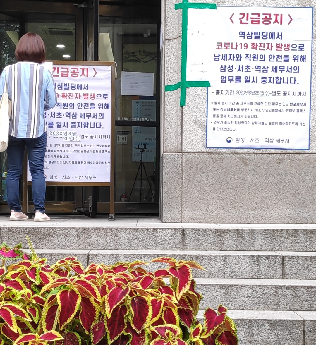 삼성·서초·역삼세무서는 8월27일 코로나19 확진자 발생으로 납세자와 직원의 안전을 위해 별도 공지가 있을 때까지 업무를 일시중지한다고 안내했다.