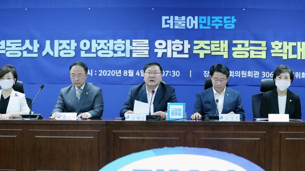 더불어민주당 김태년(가운데) 원내대표가 4일 오전 서울 여의도 국회 의원회관에서 열린 부동산 시장 안정화를 위한 주택공급 확대방안 당정 협의에서 발언하고 있다./연합뉴스