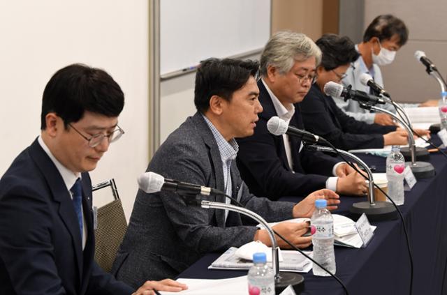한국일보 주최로 '문재인 정부 부동산 정책, 진단과 해법' 관련 경제 토론회가 25일 오후 서울 중구 대한상공회의소 중회의실에서 열려 참석자들이 토론을 하고있다. 이번 토론회는 코로나19 재확산으로 실시간으로 인터넷 중계를 하고 무청중으로 진행했다.왼쪽부터 윤지해 부동산114 수석연구원, 송인호 KDI연구원, 심교언 건국대 부동산학과 교수, 최은영 한국도시연구소장, 임재만 세종대 부동산학과 교수. 홍인기 기자