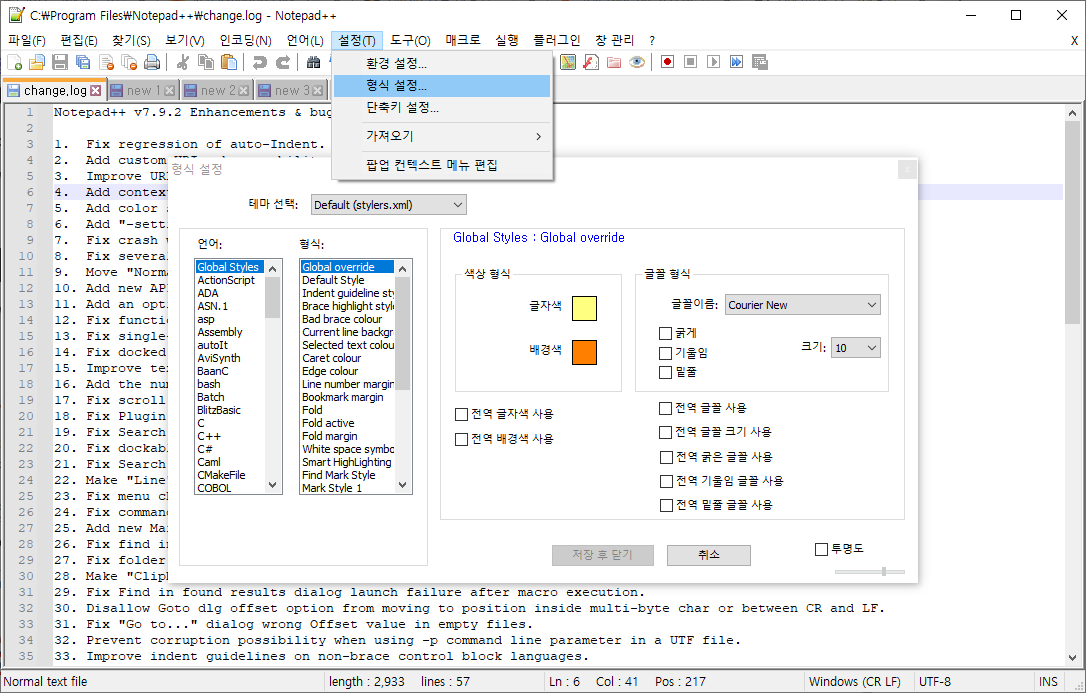 (1) 우선 설치된 Notepad++ 를 실행해서 "설정 - 형식 설정" 메뉴를 클릭하면 아래와 같이 "형식 설정" 팝업창이 뜬다.