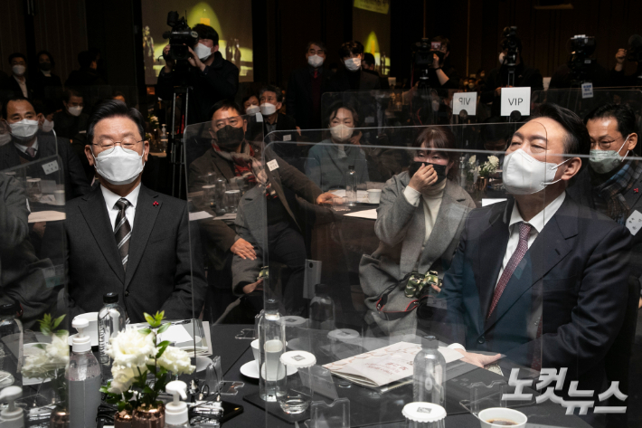 이재명 더불어민주당 대선후보와 윤석열 국민의힘 대선후보가 28일 오후 페어몬트 엠버서더 서울 그랜드 볼룸에서 열린 '국가 균형 발전을 위한 지방 소멸 대응 특별 법안 국회발의 간담회'에 참석해있다. 윤창원 기자