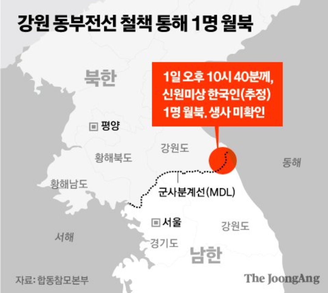 합동참모본부 동부전선 철책 뚫고 1명 월북 군은 3시간동안 몰랐다 강원도 동부전선 군사분계선(MDL) 철책을 통해 우리 국민으로 추정되는 1명이 월북하는 상황이 발생