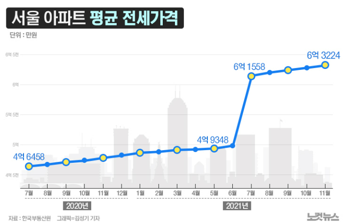 한국부동산원 통계를 보면 서울 아파트 평균 전셋값은 지난해 11월 기준 약 6억3224만원으로, 임대차법 시행 전인 2020년 7월(4억6458만원) 대비 1억6766만원 올랐다. 2020년 8월 계약갱신권을 사용한 가구가 첫 전세계약을 맺었을 시점인 2018년 8월(4억3419만원)과 비교하면 1억9805만원이나 올랐다.
