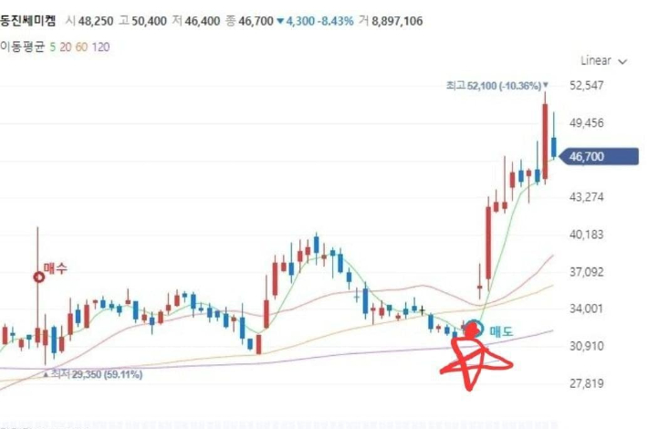 ◇ 김현정> 저는 처음에 이 얘기를 딱 들었을 때 그러면 이 횡령한 돈 가지고서 무슨 주식 작전해서 돈을 왕창 벌려고 했던 건가? 이걸 의심했는데. 그거는 아닌 것 같은 게 여러분, 동진쎄미켐이라는 회사의 차트를 보여드리겠습니다. 레인보우와 유튜브 앱으로 보세요. 이게 이제 동진쎄미켐이라는 회사의 그래프인데, 별표를 쳐놓은 저 지점에서 A씨가 자기 주식을 팔아 치웠어요. 그런데 그 사람이 팔자마자 막 뜁니다. 뛰는 거를 봐서는 지금 이 사람 매도시점 잘못 잡은 거거든요. 이런 걸로 봐서 지금 작전은 아니라는 거죠?