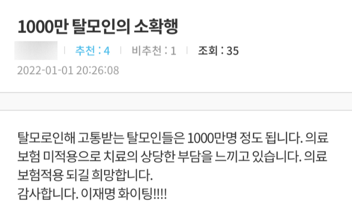 앞서 이 후보가 유권자들과 소통하고 있는 앱 '이재명 플러스'에서도 지난 1일 한 이용자가 "탈모로 인해 고통받는 탈모인들은 1천만 명 정도 된다. 의료 보험 미적용으로 치료의 상당한 부담을 느끼고 있다"며 "의료보험이 적용되길 희망한다"고 요구하기도 했다.