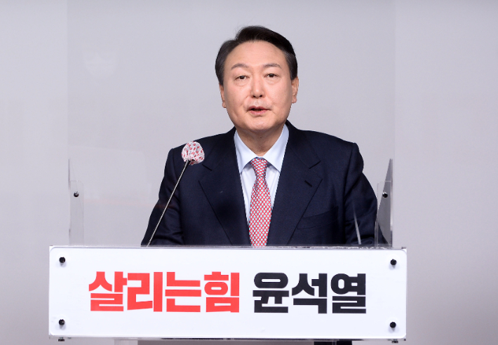 국민의힘 윤석열 대선 후보가 5일 오전 서울 여의도 당사에서 선대위 관련 기자회견을 하고 있다. 연합뉴스