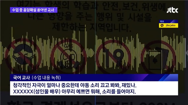 5일 JTBC는 국어 교사 A씨의 발언 일부가 담긴 녹취록을 공개하며, A씨가 수업 도중 수차례 음담패설을 늘어놨다고 보도했다.