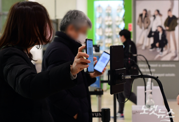 백화점, 대형마트 등 대규모 점포에 대한 방역패스(접종증명·음성확인제) 실시 의무화를 하루 앞둔 9일 서울 시내 한 백화점 입구에서 시민들이 전자출입명부 QR코드를 찍고 있다. 황진환 기자