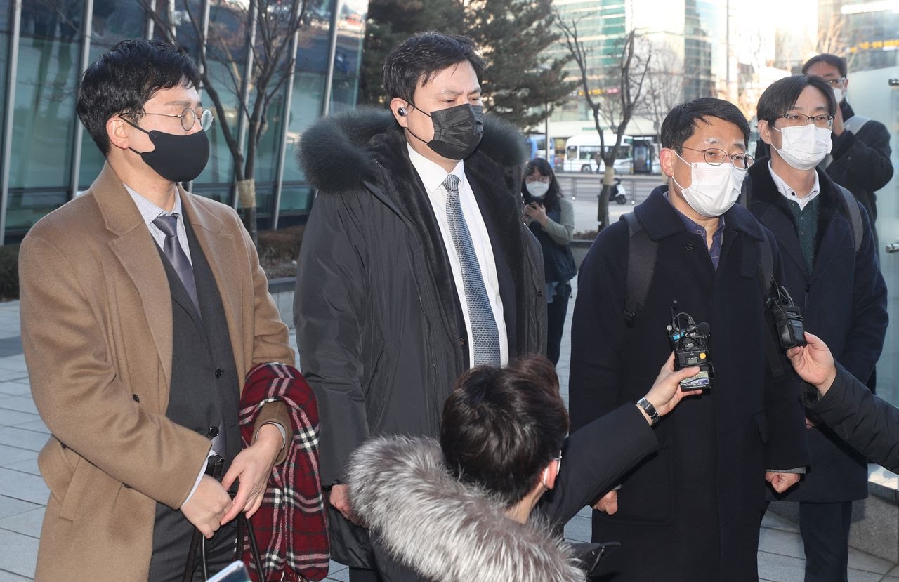 지난 7일 오후 서울 서초구 서울행정법원에서 조두형 영남대의대 교수 등 1000여 명이 정부의 방역패스 실행 효력을 중지해달라는 소송을 내면서 심문 기일 참석을 위해 법원에 출석하고 있다. (왼쪽부터) 윤용진 변호사, 박주현 변호사, 도태우 변호사, 조두형 영남대의대 교수./ 장련성 기자