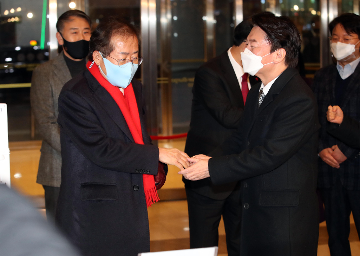 국민의당 안철수 대선 후보가 3일 대구 북구 엑스코 인터불고 호텔에서 국민의힘 홍준표 의원과 만나 인사하고 있다. 둘은 이날 2022 대구·경북 신년교례회 참석차 현장을 찾았다가 만났다. 연합뉴스.