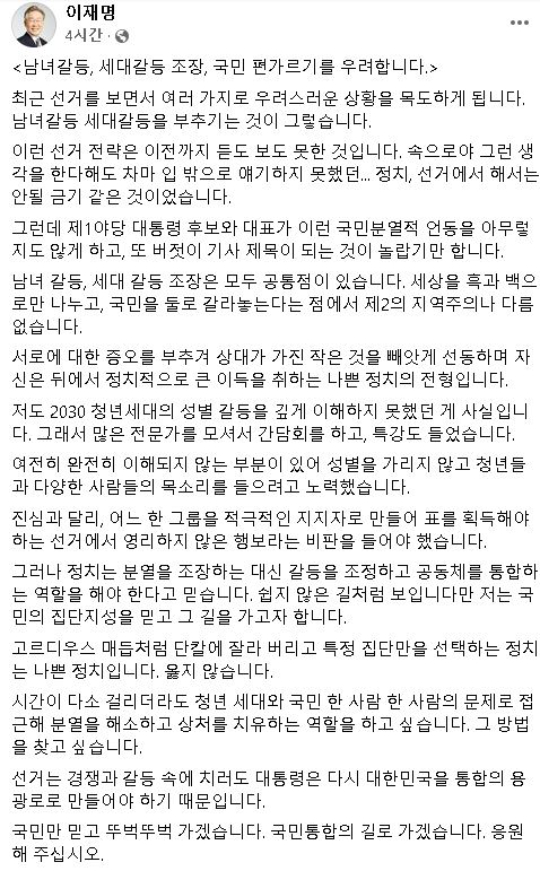 이재명 후보는 자신의 페이스북 페이지를 통해 "최근 선거를 보면서 여러 가지로 우려스러운 상황을 목도하게 된다. 남녀갈등 세대갈등을 부추기는 것이 그렇다"며 이같이 말했다.