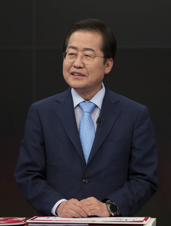 2021년 9월 16일 당시 홍준표 국민의힘 대선 경선 후보가 16일 오후 TV조선 스튜디오에서 열린 제20대 대통령선거 경선후보자 1차 방송토론회에 참석해 토론 준비를 하고 있다. 이날 홍 후보는 윤석열 후보를 향해 “조국 수사는 과잉이었다”고 공격, 강경보수로부터 비판을 받아 대선후보 경선에서 큰 부담이 됐다. © News1 국회사진취재단