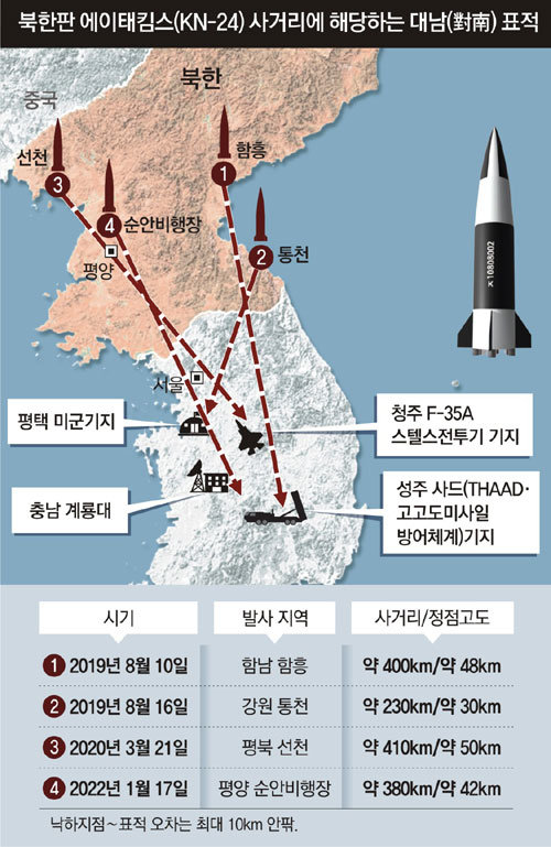 실제로 2019년 8월 10일 처음 시험발사된 KN-24는 경북 성주의 사드(THAAD·고고도미사일방어체계) 기지를 겨냥했고, 그 엿새 뒤 2차 발사 당시에는 주한미군사령부가 있는 경기 평택 미군기지(캠프 험프리스)를 정조준한 것으로 파악됐다.
