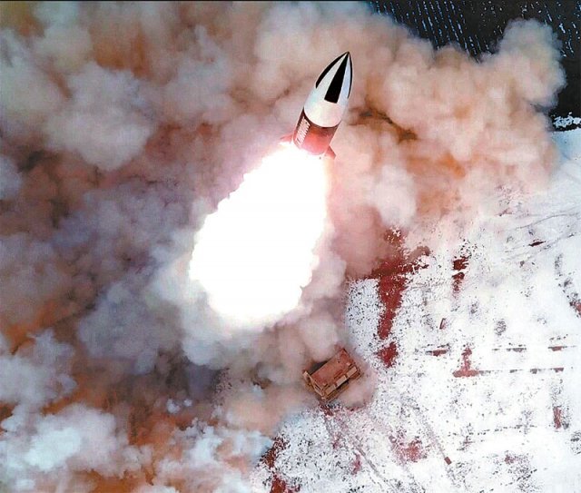 북한이 17일 평양 순안공항 일대에서 발사한 단거리 탄도미사일 KN-24. 북한 조선중앙통신은 18일 “17일 동해상의 섬 목표를 정밀 타격하는 전술유도탄의 검수사격시험이 진행됐다”며 KN-24 발사 장면을 공개했다. 조선중앙TV 캡처