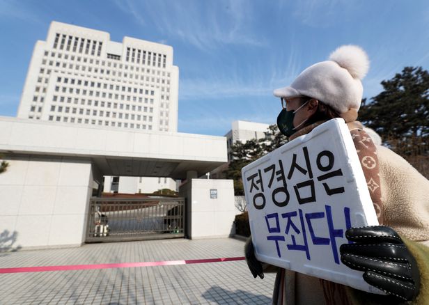 27일 오전 서울 대법원에서 조국, 정경심씨 지지자들이 정씨에 대한 무죄와 석방을 촉구하고 있다. 이날 대법원이 정씨에 대해 징역 4년 확정 판결을 내렸다. /장련성 기자