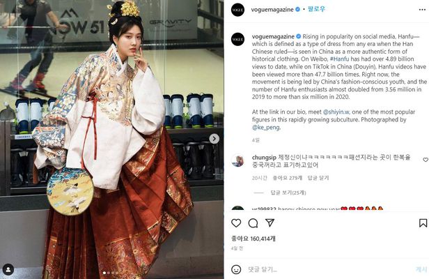 보그는 지난 2일 공식 인스타그램 계정에 한복풍 의상을 입은 중국인 유튜버 ‘시인’(Shiyin)의 사진을 올린 뒤, 시인이 입은 한복풍 의상을 ‘한푸’로 소개하며 “한족이 통치하던 시대의 역사적 의복 양식 중 하나”라고 설명했다.