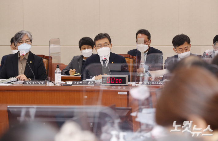 7일 국회에서 열린 보건복지위원회 전체회의. 권덕철 보건복지부 장관(가운데)이 의원 질의에 답변하고 있다. 윤창원 기자