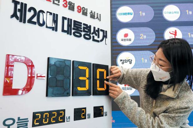 선관위 상황실에 ‘D-30 안내판’ - 중앙선거관리위원회 직원이 6일 경기도 과천시 중앙선관위 선거종합상황실에서 대통령 선거일이 7일 기준으로 30일 앞으로 다가왔다며 안내판을 ‘D-30’으로 바꾸고 있다. /연합뉴스