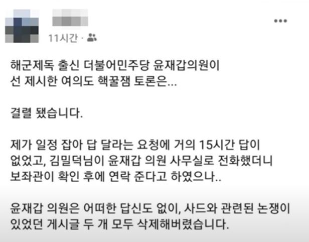 네티즌 A는 윤 의원의 토론 제안에 응했다. 그는 “여의도 가면 만나줄꺼냐” “토론 영상촬영을 하고 녹음해도 되냐. 두 명이 갈테니 다음주 목요일이나 금요일 중 하루를 달라”고 했다. 하지만 이후 A는 페이스북을 통해 “토론은 결렬됐다”며 “일정 잡아달라는 요청에 15시간 답이 없었고, 윤재갑 의원실로 문의하니 ‘보좌관이 확인 후에 연락을 주겠다’고 했지만 어떠한 답신 없이 게시글 두개를 모두 삭제해버렸다”고 했다.