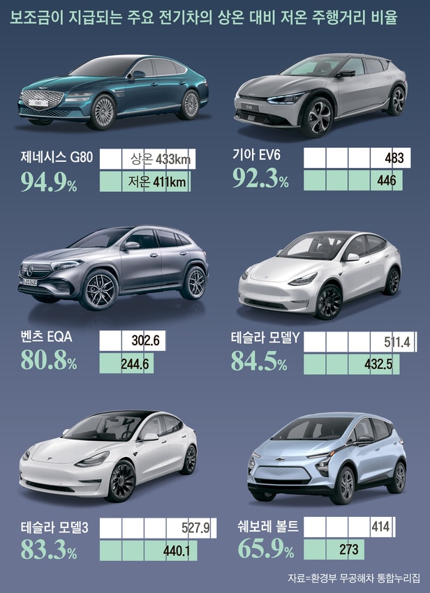 14종 전기차 중 추워도 오래가는 1위는? 혹한왕은 제네시스 G80 아닌 테슬라 모델3 롱레인지 저온 411km 보다 뛰어난 440km 우롱기사 자뻑 고취