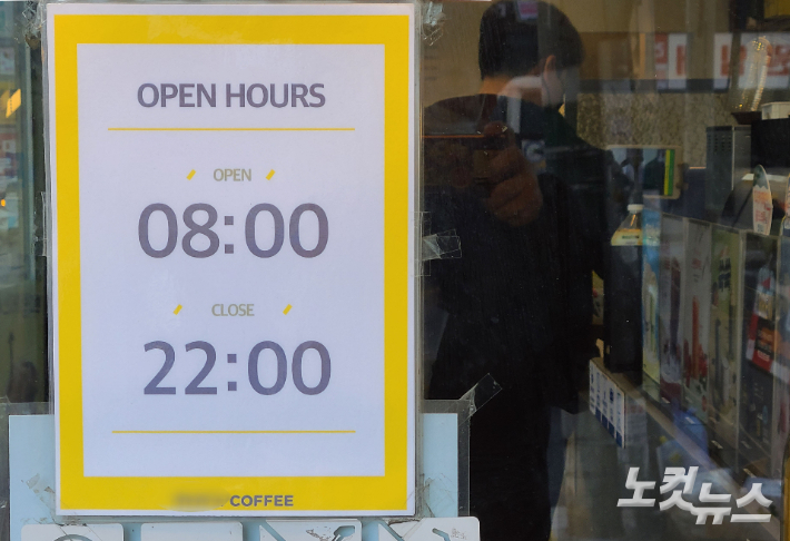 정부가 오는 19일부터 식당·카페 등의 영업시간 제한을 기존 밤 9시에서 10시로 한 시간 연장하고 인원은 그대로 6인으로 제한하기로 했다. 사진은 18일 서울 시내의 한 커피숍에 영업시간이 붙어있는 모습. 이한형 기자
