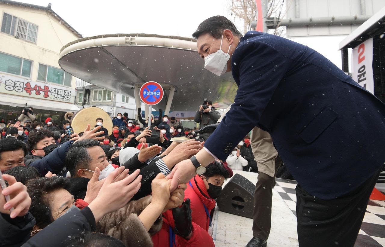 국민의힘 윤석열 대선 후보가 16일 오전 광주 광산구 송정매일시장에서 열린 '호남의 발전 책임지는 약속!' 광주 거점유세에서 지지자들의 손을 잡아주고 있다. /연합뉴스