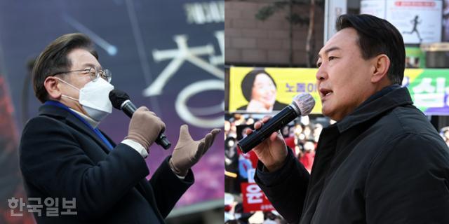 이재명 더불어민주당 대선후보가 17일 서울 중구 청계광장에서 열린 '다시 광화문에서' 거리유세에 참석해 지지를 호소하고 있다(왼쪽 사진). 오른쪽 사진은 같은 날 서울 송파구 석촌호수에서 유세 중인 윤석열 국민의힘 대선후보. 오대근 기자