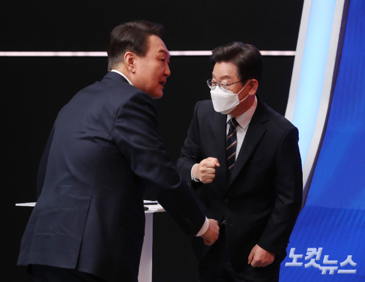 21일 오후 서울 마포구 MBC 미디어센터 공개홀에서 열린 중앙선거방송토론위원회 주관 제20대 대통령선거 후보 초청 1차 토론회에 앞서 윤석열 국민의힘 대선후보와 이재명 더불어민주당 대선후보가 인사를 하고 있다. 국회사진취재단