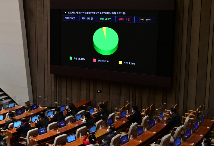 국회 '16.9조 추경' 의결 (서울=연합뉴스) 하사헌 기자 = 총 16조 9천억 원의 추가경정예산안이 21일 오후 서울 여의도 국회에서 열린 본회의에서 통과되고 있다. 추경안은 소상공인 및 사각지대 지원에 13조5천억 원, 방역 지원에 2조8천억 원, 예비비 6천억 원으로 구성됐다. 2022.2.21 [국회사진기자단] toadboy@yna.co.kr (끝) 연합뉴스