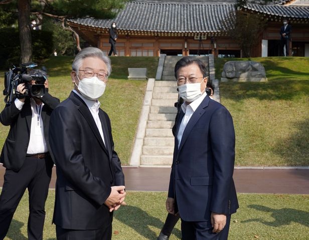 문재인 대통령이 2021년 10월 26일 더불어민주당 이재명 대선후보와 차담을 위해 청와대 상춘재로 들어서고 있다. /연합뉴스