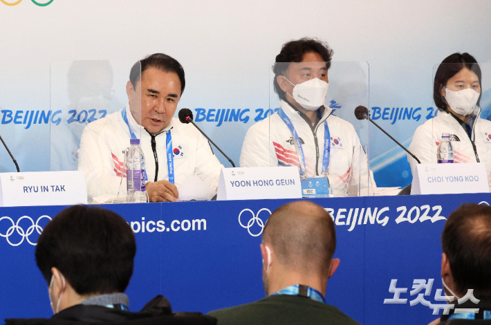 8일 중국 2022 베이징동계올림픽 메인미디어센터에서 열린 쇼트트랙 편파판정에 대한 선수단장 긴급 기자회견에서 윤홍근 선수단장이 모두발언을 하고 있다. 베이징(중국)=박종민 기자