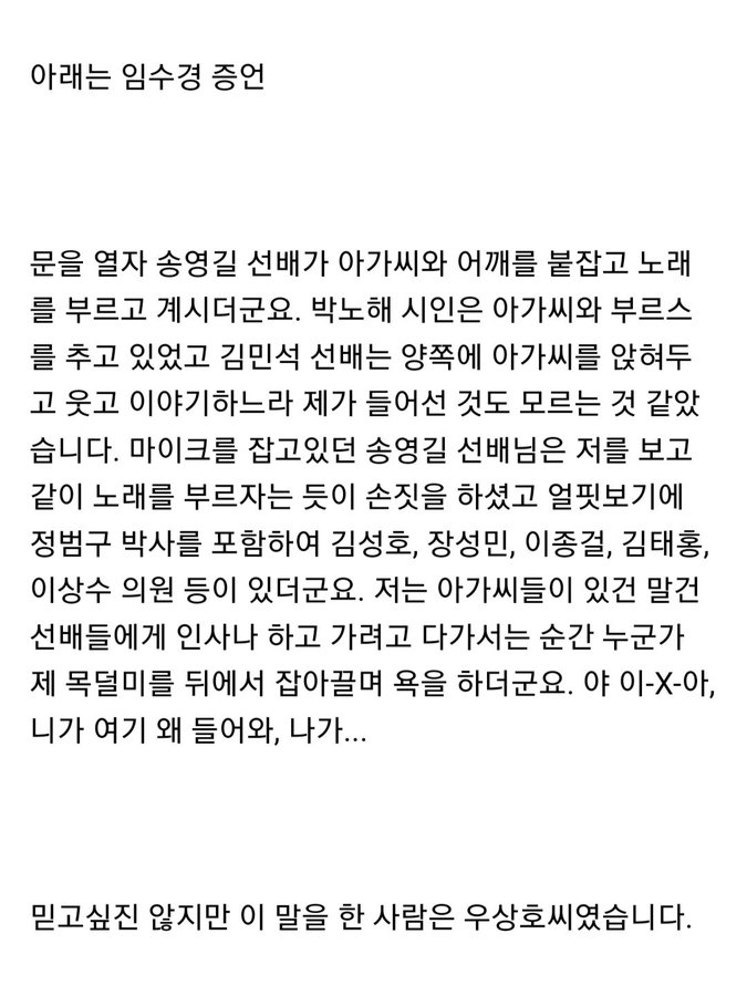 이들은 이어 "그러나 그날 술자리를 가졌다는 사실만으로도 참석자들 모두 깊이 반성하고 사과드린다. 앞으로 더 사려 깊게 처신하라는 경종으로 받아들이겠다" 고 덧붙였다.